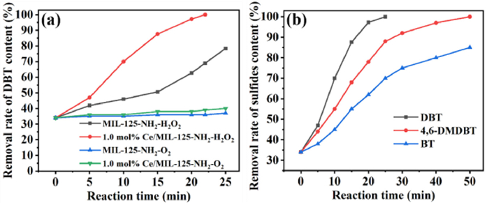 | Fig. 4. (a) Photocatalytic DBT desulfurization rate of MIL-125-NH2 and 1.0 mol% Ce/MIL-125-NH2 at O2 atmosphere. (b) Removal of different sulfur-containing substrates. Reaction conditions: T = 30 ℃, mcatal = 10 mg, Voil = 5 mL, initial S content = 1000 ppm, and VH2O2 = 50 µL. | |
