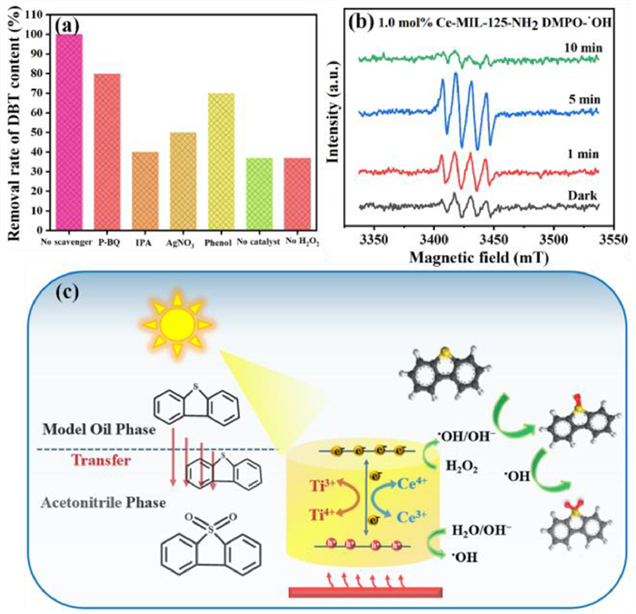 | Fig. 5. (a) Effect of adding different scavengers on photocatalytic oxidation of DBT with 1.0 mol% Ce/MIL-125-NH2. (b) ESR spectra of 1.0 mol% Ce/MIL-125-NH2 under dark and different time illumination. (c) Proposed mechanism of photocatalytic oxidation of DBT on Ce/MIL-125-NH2. | |