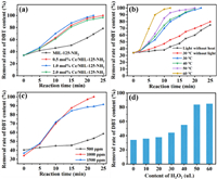 | Fig. 3. (a) Photocatalytic DBT desulfurization rate of MIL-125-NH2 and Ce/MIL-125-NH2 at 30 ℃. (b) DBT desulfurization of 1.0 mol% Ce/MIL-125-NH2 sample at different temperatures. (c) The effect of different DBT concentrations on the photocatalytic DBT desulfurization performance at 30 ℃. (d) The desulfurization effect of 1.0 mol% Ce/MIL-125-NH2 catalyst under different H2O2 additions. | |