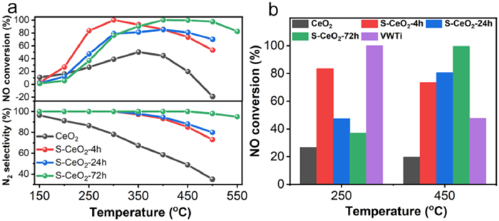 | Fig. 2. (a) NO conversion and N2 selectivity of CeO2 and sulfated CeO2 as a function of temperature, and (b) comparison of activity results with commercial V2O5-WO3/TiO2 at 250 ℃ and 450 ℃, respectively. Reaction condition: 500 ppm NO, 500 ppm NH3, 5% O2, balanced with Ar, WHSV = 60,000 mL g−1 h−1. | |