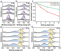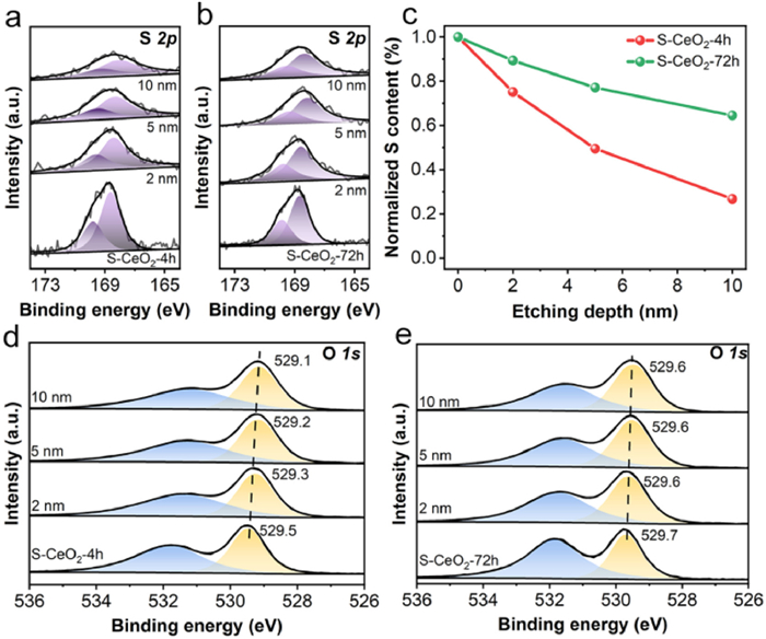 | Fig. 3. Ion sputtering XPS of S 2p of (a) S-CeO2–4h and (b) S-CeO2–72h. (c) Normalized S content as a function of etching depth. Ion sputtering XPS of O 1s of (d) S-CeO2–4h and (e) S-CeO2–72h. | |