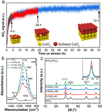 | Fig. 1. (a) SO2 breakthrough profiles over CeO2 at 150 ℃ for different durations; (b) ATR-IR and (c) XRD patterns of CeO2 and sulfated CeO2. | |