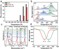 | Fig. 4. (a) NH3 oxidation, (b) NH3-TPD, and (c) in situ DRIFTS of NH3 adsorption over CeO2, S-CeO2–4h, and S-CeO2–72h. (d) NO-TPSR of S-CeO2–4h and S-CeO2–72h. | |