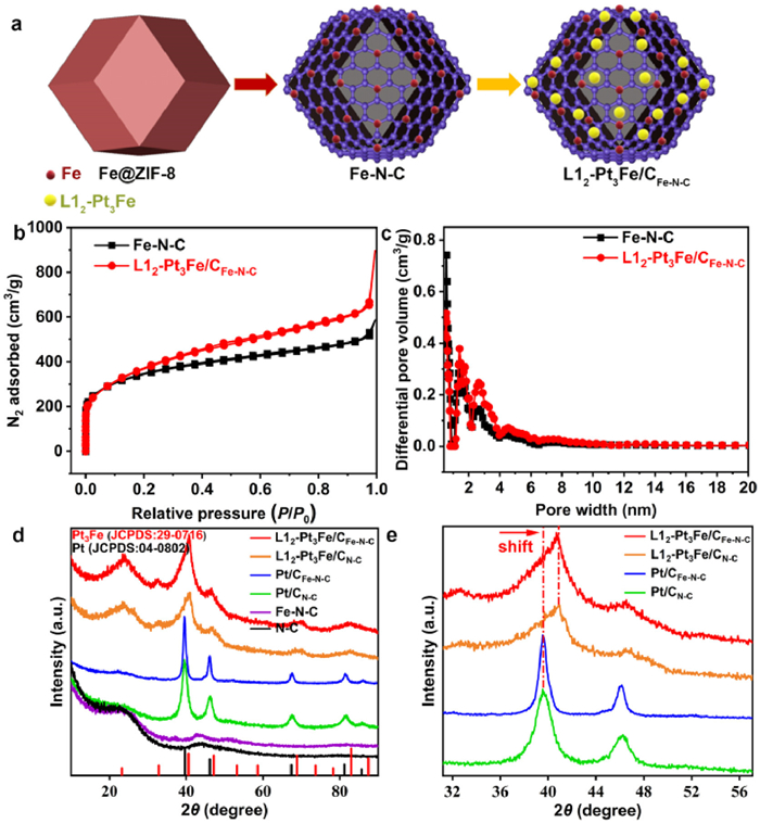| Fig. 1. (a) synthetic procedures for L12-Pt3Fe/CFe-N-C. (b) Nitrogen adsorption-desorption isotherms of L12-Pt3Fe/CFe-N-C and Fe-N-C. (c) Pore size distribution of L12-Pt3Fe/CFe-N-C and Fe-N-C. (d) XRD patterns of different catalysts. (e) The shift of Pt (111) to big angle in XRD pattern. | |