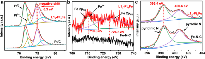 | Fig. 3. (a) Pt 4f spectra of L12-Pt3Fe/CFe-N-C and Pt/C. (b) Fe 2p spectra of L12-Pt3Fe/CFe-N-C and Fe-N-C. (c) N 1s spectra of L12-Pt3Fe/CFe-N-C and Fe-N-C. | |