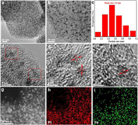 | Fig. 2. (a, b) TEM images of L12-Pt3Fe/CFe-N-C. (c) Particle size of L12-Pt3Fe/CFe-N-C. (d-f) HRTEM images and lattice fringes of L12-Pt3Fe/CFe-N-C. (g-i) EDS-elemental mappings of Pt and Fe. | |