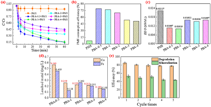 | Fig. 1. (a) Removal efficiency of SAM, (b) corresponding PMS consumption efficiency, (c) EE/O values and (d) metal ions leaching amount (reaction conditions: [Catalyst]0 = 60 mg/L, [PMS]0 = 300 mg/L, [SAM]0 = 10 mg/L, pH 5.85 (unadjusted), reaction temperature = 30 ℃). (e) PBA-1/PMS reaction system SAM removal efficiency used to determine the repeatability (reaction conditions: [PBA-1]0 = 60 mg/L, [PMS]0 = 300 mg/L, [SAM]0 = 10 mg/L, pH 5.85 (unadjusted), reaction time = 60 min, reaction temperature = 30 ℃). | |