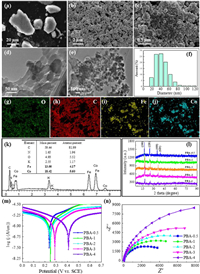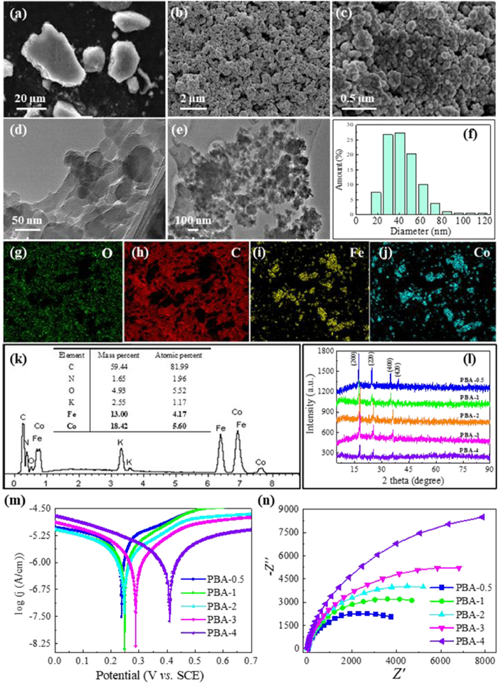 | Fig. 2. (a-c) SEM and (d, e) TEM images of the Co1Fe1 PBA. (f) Particle size distribution of Co1Fe1 PBA. Elemental mapping images of (g) O, (h) C, (i) Fe and (j) Co of the as-obtained Co1Fe1 PBA sample. (k) EDS spectrum of the as-obtained Co1Fe1 PBA sample. (l) XRD patterns of the as-prepared CoFe PBAs. (m) Tafel polarization curve and (n) electrochemical impedance spectroscopy (EIS) plots of the as-obtained CoFe PBAs. | |