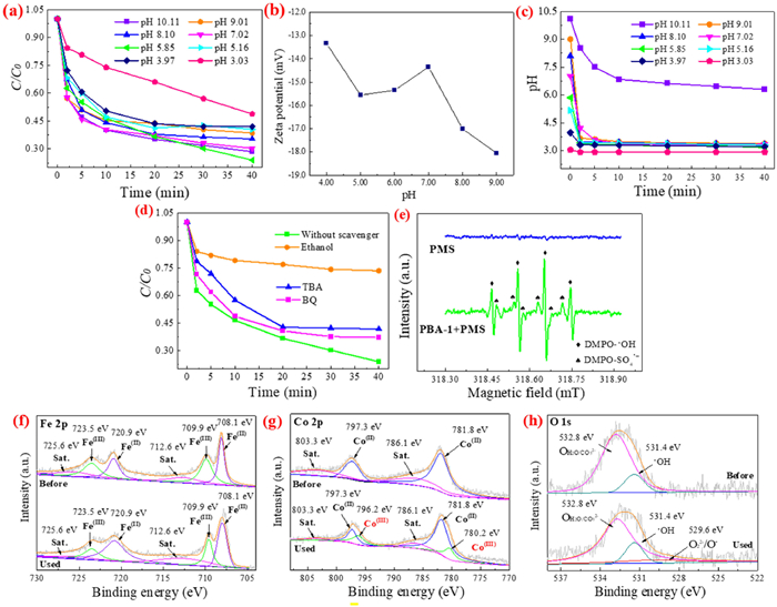 | Fig. 3. (a) Effect of pH on the degradation of SAM and (b) pH change (reaction conditions: [PBA-1]0 = 60 mg/L, [PMS]0 = 300 mg/L, [SAM]0 = 10 mg/L, pH 3.03, 3.97, 5.16, 5.85, 7.02, 8.10, 9.01 and 10.11, reaction temperature = 30 ℃). (c) Zeta potential of PBA-1 under different pH values. (d) Effect of the radical scavengers on SAM degradation in the PBA-1/PMS reaction system (reaction conditions: [PBA-1]0 = 60 mg/L, [PMS]0 = 300 mg/L, [Corresponding radical scavenger] = 10 mmol/L, [SAM]0 = 10 mg/L, pH 5.85 (unadjusted), reaction temperature = 30 ℃). (e) EPR spectra in various reactions (reaction conditions: [PBA-1]0 = 60 mg/L, [PMS]0 = 300 mg/L, reaction temperature = 30 ℃, SAM was not added). (f) Fe 2p, (g) Co 2p and (h) O 1s XPS spectra of PBA-1 before and after five cycles of the SAM degradation reaction. | |