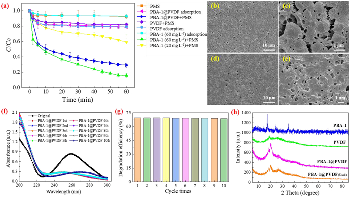 | Fig. 4. (a) Removal of SAM in the different reaction systems (reaction conditions: [PMS]0 = 300 mg/L, [SAM]0 = 10 mg/L, pH 5.85 (unadjusted), reaction temperature = 30 ℃). SEM images of (b, c) bare PVDF, (d, e) PBA-1@PVDF. Cycle test of PBA-1@PVDF: (f) absorption spectra of the SAM solution and (g) SAM degradation efficiency (reaction conditions: 5*10 cm2 PBA-1@PVDF, [PMS]0 = 300 mg/L, [SAM]0 = 10 mg/L, pH 5.85 (unadjusted), reaction time = 60 min, reaction temperature = 30 ℃). (h) XRD spectra of PVDF, PBA-1 and PBA-1@PVDF before and after repeated SAM degradation reactions. | |