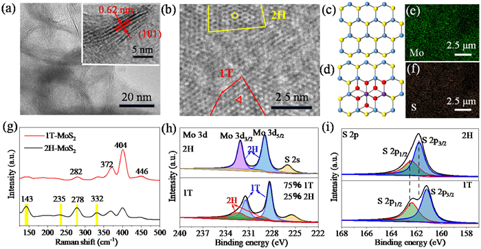 | Fig. 1. (a) TEM images of 1T-MoS2 nanosheets; the inset shows the layers and interlayer spacing of the MoS2 nanosheets. (b) HRTEM image of the 1T-MoS2 nanosheets. (c, d) Diagrammatic representation of the 2H phase and 1T phase. (e, f) Element mapping of 1T-MoS2 nanosheets. (g) Raman spectra and (h, i) XPS of 1T-MoS2 and 2H-MoS2 nanosheets. | |