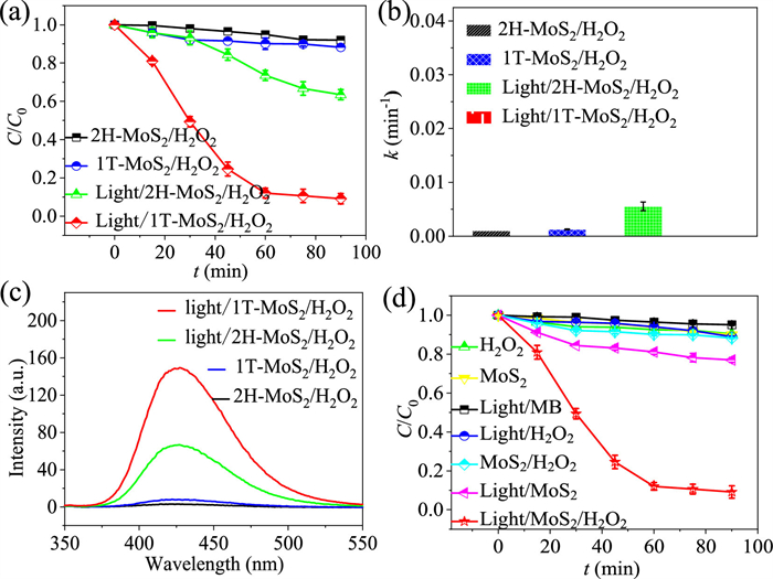 | Fig. 2. (a) Degradation efficiency of MB using different MoS2 samples with and without light irradiation. (b) Corresponding kinetic constant values of MB degradation in different systems. (c) Fluorescence spectra for detecting •OH by quenching with TA at 40 min. (d) Degradation of MB by 1T-MoS2 in different systems. Conditions: [MB] = 10 mg/L, pH0 3.0, [MoS2] = 0.05 g/L, [H2O2] = 1.0 mmol/L. | |