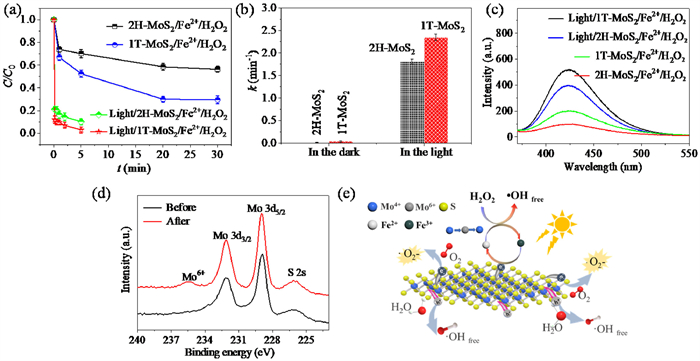 | Fig. 4. (a) MB degradation and (b) corresponding k values in different systems. (c) Fluorescence spectra for detecting •OH by quenching with TA at 5 min. (d) XPS spectra of Mo 3d before and after the reaction in the light/1T-MoS2/Fe2+/H2O2 system. (e) Proposed cocatalytic mechanism in light/Fe2+/MoS2/H2O2 systems. Conditions: [MB] = 10 mg/L, pH0 3.0, [MoS2] = 0.05 g/L, [H2O2] = 1.0 mmol/L), [FeSO4·7H2O] = 0.02 g/L. | |