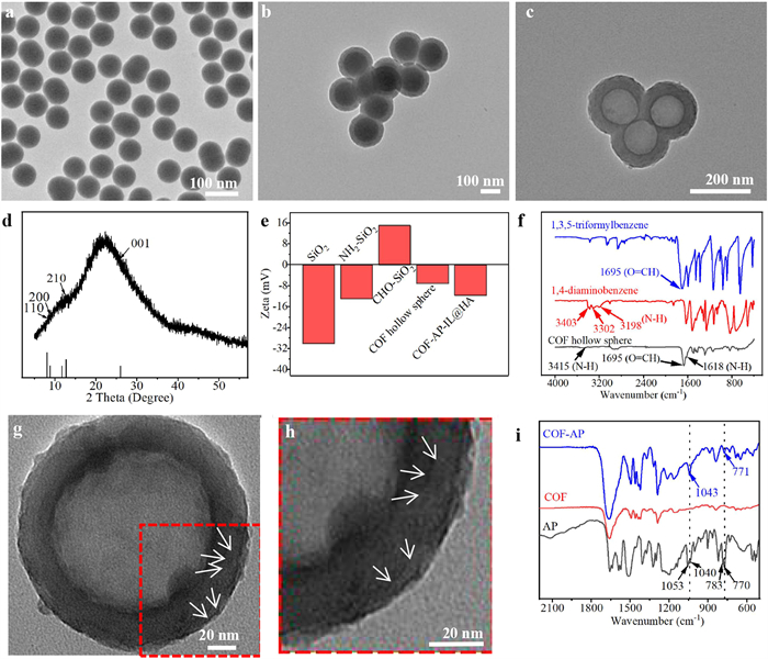 | Fig. 1. TEM images of various particles: (a) SiO2, (b) COF@SiO2, (c) hollow COF. (d) XRD pattern of hollow spheres. (e) Potential changes of various particles. (f) FTIR spectra of reactants and products. (g, h) TEM images of a magnified hollow sphere. (i) FTIR spectra of hollow COF before/after loading drug. | |