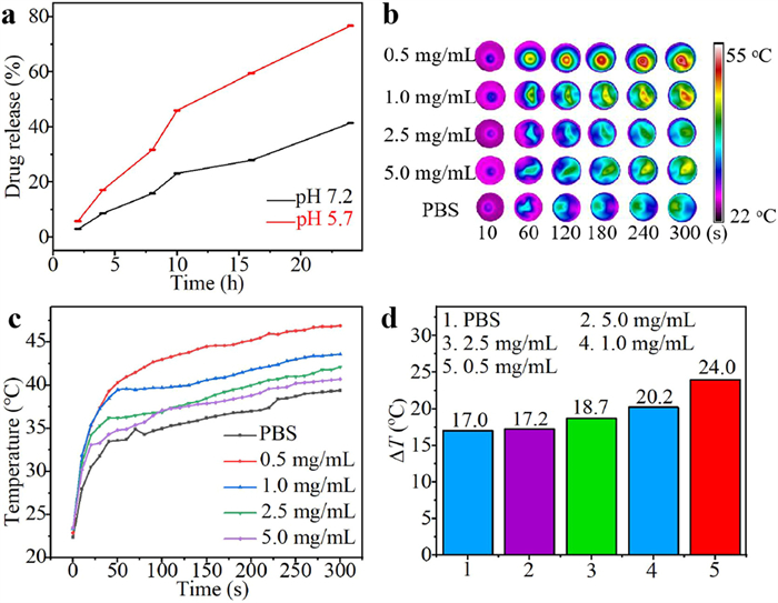 | Fig. 2. (a) Apatinib release of COF-AP-IL@HA in PBS with two pH values. Temperature changes of COF-AP-IL@HA suspension with different concentration under MW: (b) infrared thermal images; (c) temperature change curves; (d) heated temperatures; MW irradiation: 1.8 W, 5 min. | |