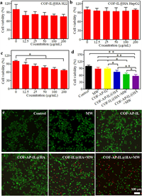 | Fig. 3. Cell viability of COF-IL@HA with various concentrations: (a) H22, (b) HepG2, (c) COF-AP-IL@HA on HepG2. (d) Viability of H22 cells under different treatments. (e) Images of stained H22 cell in therapy experiments: green live cells and red dead cell. *P < 0.05, and **P < 0.01 show significant difference between two corresponding groups. | |