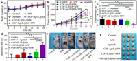 | Fig. 4. Therapeutic evaluation of COF-AP-IL@HA in vivo. (a) Body weight of HepG2 tumor-bearing mice in each group in 19 days of treatment. (b) Tumor volumes of different groups. (c) Tumor weights of different groups, showing statistically significant difference between COF-AP-IL@HA+MW and other group. (d) Tumor inhibition rates of each group. (e) Representative photographs of mice and (f) tumor tissue from different groups at 19th day post treatment. Statistical analysis: *P < 0.05, **P < 0.01. | |