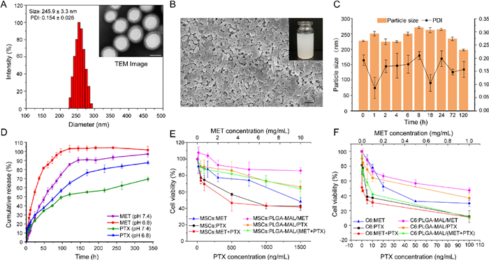 | Fig. 1. Characterization of the prepared nanoparticles. (A) Size distribution histogram, PDI and TEM image (insert) of PLGA-MAL/(MET+PTX) nanoparticles. Scale bar: 200 nm. (B) SEM image of PLGA-MAL/(MET+PTX) nanoparticles. Scale bar: 2 µm. Inset: PLGA-MAL/(MET+PTX) suspension. (C) Particle size and PDI of PLGA-MAL/(MET+PTX) nanoparticles after incubation with 10% FBS at different time points at 37 ℃. (D) In vitro release profiles of MET and PTX from PLGA-MAL/(MET+PTX) nanoparticles in PBS (pH 7.4 and 6.8) containing 0.5% Tween-80. (E) Cell viability of MSCs and (F) C6 cells treated with different formulations for 72 h. Data were presented as mean ± S.D. (n = 5). | |