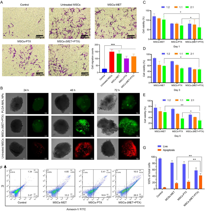 | Fig. 2. (A) Representative images and quantification of migrated MSCs after exposure to different formulations in response to C6 cells. Scale bar: 200 µm. (B) 3D laser scanning confocal microscope images of C6 glioma spheroids. C6 glioma spheroids were incubated with PLGA-MAL/(MET+PTX) nanoparticles (FITC, green), MSCs-(MET+PTX) (FITC, green) and untreated MSCs (DiI, red) for 24, 48 and 72 h. Scale bar: 25 µm. (C–E) Cell viability of C6 cells exposed to MSCs-MET, MSCs-PTX and MSCs-(MET+PTX) with different cell density and incubation time. Flow cytometry analysis (F) and (G) statistical analysis of apoptotic C6 cells induced by different MSCs-based formulations on day 5. Data were shown as mean ± S.D. (n = 5, P < 0.05, **P < 0.01, ***P < 0.001). | |
