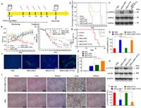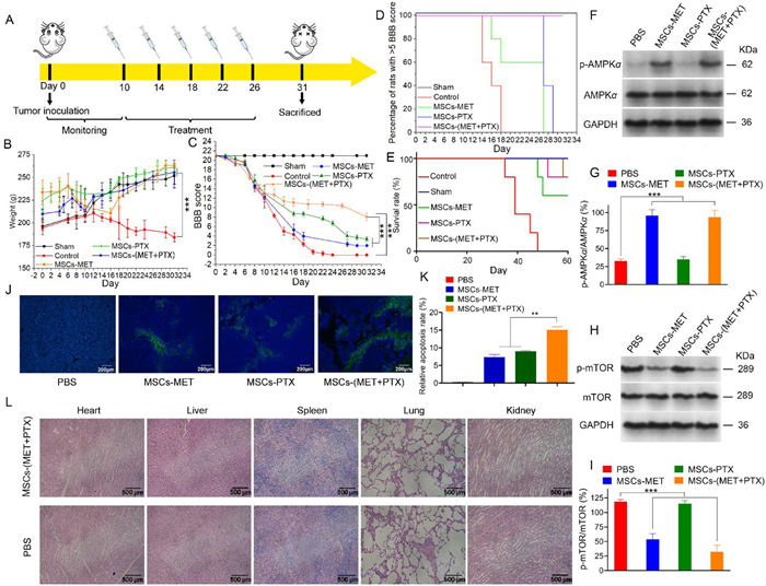 | Fig. 4. (A) Treatment regimen. (B) Body weight analysis and (C) BBB scores of sham-operated and C6 tumor-bearing rats after treatment with PBS and different MSCs-based formulations. (D) Kaplan-Meier graph of the onset of hindlimb paralysis (BBB functional score < 5). (E) Survival curves of sham-operated rates and C6-tumor bearing rats treated with PBS and different MSCs-based formulations. (F, H) Representative western blot analysis of protein levels in C6 tumor sites after treatment with PBS and different MSCs-based formulations. GAPDH was used as loading control. (G, I) Quantitative analysis of the protein levels of phosphorylated AMPKα, AMPKα, phosphorylated mTOR, mTOR that are associated with the activation of AMPK pathway. (J) TUNEL staining and its (K) quantification of IMSCT sections in rats treated with PBS and different MSCs-based formulations. Scale bar: 200 µm. (L) H & E stained sections of major organs in rats treated with PBS and MSCs-(MET+PTX). Scale bar: 500 µm. Data were shown as mean ± S.D., n = 5, **P < 0.01, ***P < 0.001. | |