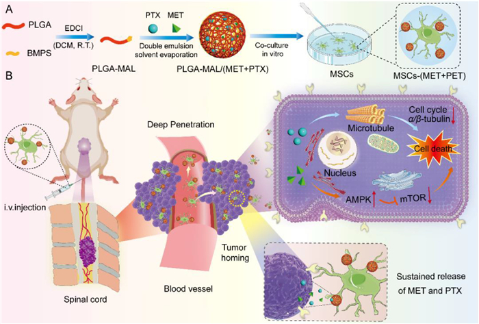 | Scheme 1. Schematic illustration of (A) design of MSCs-(MET+PTX) nanoplatform and (B) its antitumor mechanism. | |