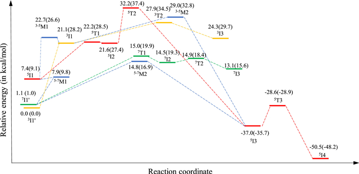 Three reaction routes for the dioxygen activation reaction catalyzed by α-KG dependent dioxygenase activation reaction have been advanced so far [6, 23-25]. In the first route, this reaction mainly runs on a quintet PES consisting of steps including the formation of an Fe(Ⅲ)-O2 adduct, and/or the generation of bicyclic superoxo intermediate [26], decarboxylation, and O—O bond heterolytic cleavage [6, 20, 25]. In the second route, the initial two steps including the formation of the O2 adduct and the decarboxylation and O—O bond cleavage run on a septet surface. Then the generated Fe-oxo intermediate switches to the quintet spin by intersystem crossing [6, 27]. In the last route, the binding of triplet dioxygen to the quintet catalytic metal center affords a triplet Fe(Ⅳ)-alkyl peroxo bridged intermediate. Then this structure decay to a quintet Fe(Ⅱ)-peracid intermediate via a triplet-quintet spin crossing, followed by a heterolytic O—O cleavage step (on quintet surface) affording the Fe(Ⅳ)-oxo intermediate [28]. Wójcik et al. carefully studied these reaction routes with dispersion-corrected DFT methods employing B3LYP functionals [6], the robust of which was supported by CCSD(T) benchmark calculations. Their calculation results support the first reaction route.