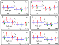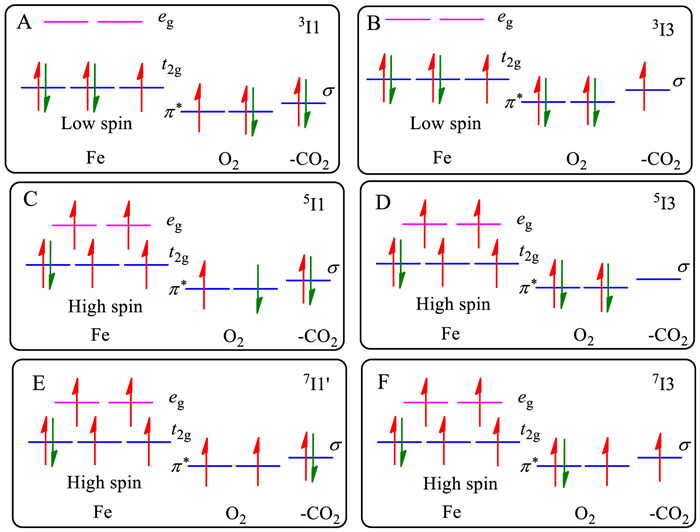 The above discussions suggest that the release of carbon dioxide can only occur in the 5I3-formating reaction step. It is beneficial to address why quintet spin is necessary for the CO2 releasing. Collected in Fig. 3 are the qualitative molecular orbital (MO) schemes of 3/5I1, 7I1′, and 3/5/7I3. More MO schemes are presented in Figs. S9 and S10 (Supporting information). In the pre-reactive complex 3I1 (Fig. 3A), five electrons are distributed in the Fe 3d-based t2g MO in a low-spin manner (SFe = 1/2), leaving the high-energy eg MO empty. The dioxygen has withdrawn an electron from the metal ion affording a peroxyl radical anion (SO2 = 1/2). In the corresponding intermediate 3I3 (Fig. 3B), this dioxygen further withdraws a β electron from the σ MO of the carboxyl group, leaving an unpaired α electron in that σ MO. The carboxyl group must give out this α electrons in order to leave the substrate as carbon dioxide. The only possible destination for this transfer is the eg MOs of the ferric ion, since the dioxygen π* MOs are fully occupied after accepting two electrons. However, this transfer is thermodynamically unfavorable due to the high energy of the eg MOs. Thus, this α electron will stay within the carboxyl group leading to the failure of carbon dioxide release. Similar α electron transferring problem happens in the septet spin. In the pre-reactive complex 7I1′ (Fig. 3E), four unpaired α electrons are distributed in ferrous t2g and eg MO in a high-spin manner (SFe = 2). In addition, two α electrons align parallelly in the π* MO of dioxygen. In the intermediate 7I3, the dioxygen has taken one β electron from the carboxyl group. However, neither the dioxygen nor the ferrous ion is able to taken the remaining α electron from the carboxyl group since all destination MOs of dioxygen and ferrous ion are occupied by unpaired α electrons (Fig. 3F). Different to 3I1 or 7I1′, in 5I1 structure (Fig. 3C) the dioxygen is in a singlet state (SO2 = 0). This unique structure enables the dioxygen capable of accommodating a pair of electrons with opposite spins delivered from the carboxyl group (Fig. 3D) and thus facilitate the departure of this group as carbon dioxide. The present analysis shows that the electronic structure of dioxygen in the pre-reaction complex dominate the decarboxylation reaction.