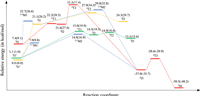 | Fig. 1. Relative energies and Gibbs free energies of stationary points and MECPs located in HPPD-catalyzed dioxygen activation reaction obtained at the QM/MM B3LYP-D3/6-311++G(d, p): AMBER level. The reaction coordinate was set as RC2′-C3′ - ROa-C2′ (the difference of the interatomic distance between atom pairs C2′-C3′ and Oa-C2′) for the steps covering I1 to I3 and was set as ROa-Ob for the step covering I3 to I4. Profile color codes: yellow for triplet, red for quintet, green for septet and blue for MECP. | |