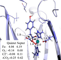 The reaction route runs on the septet surface consists of two steps, dioxygen addition and decarboxylation (Fig. S4 in Supporting information). Geometrical parameters for the first transition state 7T1 are quite resembles the ones in 3T2 with Oa-Fe distance of 1.4 Å and C2′-C3′ distance 1.8 Å. However, this reaction step leads to a peroxyl adduct 7I2 in which the carboxyl group is still weakly bonded with the keto carbon with C2′-C3′ distance of 2.1 Å. In the subsequent decarboxylation step, the carboxyl group leaves the keto group affording the intermediate 7I3. Similar to the case of 3I3, in 7I3 the V-shaped carboxyl group is still covalently bonded with the metal ion with Fe-O distance 2.1 Å. Electronic structure analysis shows that during these two steps two β electrons, one from the carboxyl group and the other from the metal ion, are transferred to the dioxygen.