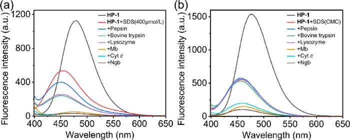 The selectivity of the sensor was also investigated. As shown in Fig. 4a, heme proteins lead to obvious fluorescence quenching of the sensor, and the wavelength red-shifted back to 475 nm, while other proteins just showed a quenching response at 450 nm. To explore the importance of surfactant for providing the environment, the probe itself for sensing proteins was observed. All of the proteins showed a quenching response at 475 nm (Fig. S4 in Supporting information). These results suggest that HP-1 was not selective for heme proteins. All these results demonstrated the selectively sensing performances of HP-1/SDS for heme proteins. A possible reason was that imidazole bound to the cavity of the heme pocket leads to an environmental change for the acetylpyrene group from SDS atmosphere.
