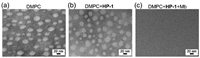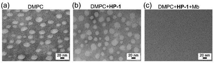 | Fig. 5. TEM images of DMPC vesicles in aqueous solution (a), treated with HP-1 (10 µmol/L) (b) and then incubated with 5 µmol/L Mb (c). Scale bar: 20 nm. | |