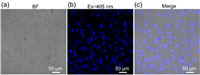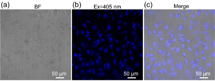 | Fig. 6. Confocal fluorescence images of HeLa cell incubated with HP-1 (10 µmol/L). (a) Bright fields of HeLa cell; (b) Fluorescence imaging of HeLa cell from blue channel, collected at 410–585 nm; (c) Merged. Scale bar: 50 µm. | |