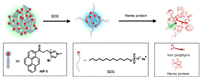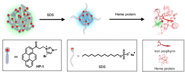 In this study, we reported a simple fluorescent ensemble sensor based on small fluorophore and surfactant assemblies for sensing heme proteins. The structure of designed fluorophores HP-1 was shown in Scheme 1. Imidazole has been reported that it can bind to a heme protein within a cavity formed in the proximal heme pocket from the interior of the protein to the surface [23-26]. Acetylpyrene was an important environment-sensitive pyrene derivative according to its different aggregate states as shown in our previous study [27]. Herein, HP-1 was aggregated to form nanoparticles and displayed a long-wavelength peak at 475 nm in aqueous solutions. After the addition of sodium dodecyl sulfate (SDS), the anionic surfactant disassembled the fluorophore and induced fluorescence emission blue-shift of the encapsulated probe by interacting with imidazolium. The binding between imidazole and heme pocket provided a different microenvironment for the fluorophore, which resulted in the ensembles sensor HP-1/SDS, indicating the specific detection of heme proteins. Subsequently, based on the signals of heme proteins with HP-1/SDS micelle, 1, 2-dimyristoyl-sn‑glycero-3-phosphocholine (DMPC) could be established as a simple model for studying the heme protein with the cell membrane visualized by transmission electron microscopy (TEM) and optical microscope.