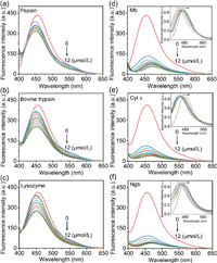 | Fig. 3. Fluorescence spectra of HP-1/SDS (10 µmol/L/400 µmol/L) in aqueous buffer solution (20 mmol/L PBS, pH 7.4) upon titration of proteins (0–12 µmol/L): (a) pepsin, (b) bovine trypsin, (c) lysozyme, (d) Mb, (e) Cyt c and (f) Ngb. Inset: Amplification of the fluorescence intensity at 400–600 nm shown in panel d, e, f. | |