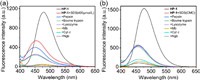 | Fig. 4. (a) Fluorescence spectra of HP-1/SDS (10 µmol/L/400 µmol/L) treated with 6 species of proteins (12 µmol/L); (b) Fluorescence spectra of HP-1/SDS (10 µmol/L/CMC) treated with 6 species of proteins (12 µmol/L). | |