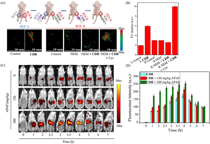 Next, the ability of CDR for real-time monitoring of endogenous Cys and non-invasive in-situ visualization of early DILI diagnosis was evaluated. First, three groups of healthy mice were injected with different doses of APAP (0, 150, 300 mg/kg) through the tail vein. As shown in (Fig. 2C), there were slight change in fluorescence signal in the liver of healthy mice after injected of CDR (control group). This indicates that CDR could be enriched in the liver and identify of endogenous Cys in vivo. Initially, no fluorescence signal was given to the liver region of mice with a small dose of APAP (150 mg/kg), but as the drug was administered over time, the fluorescent signal in the liver region gradually enhanced, and reached a maximum intensity of 4 h. We found that when mice were injected with high dose of APAP (300 mg/kg) for 4 h, the PA signal intensity of liver became observably higher than the pure CDR group, suggesting that the concentration of Cys in the liver increased with the aggravation of DILI. These experiments demonstrate that CDR can image Cys level during the development of APAP-induced acute liver injury (Figs. 2C and D). It is worth noting that the fluorescence signal gradually decreased after 4 h, which we speculated was because CDR was excreted from the body by metabolism. These experiments demonstrate that CDR could enable real-time in situ identification of Cys level during the development of APAP-induced early liver injury.