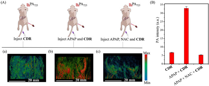 | Fig. 3. (A) In vivo PA imaging of mouse liver injury model. (a) There was no obvious PA signal in liver when injected CDR (100 µL, 30 µmol/L) into caudal vein for 3 h. (b) A liver injury model was established by APAP (300 mg/kg) for 4 h and then CDR (100 µL, 30 µmol/L) was injected into caudal vein for 3 h. PA imaging showed strong fluorescence. (c) After a caudal vein injection of APAP for 4 h to establish a liver injury model, the PA imaging signal was significantly weakened after caudal vein injection of NAC (100 µL, 3 mmol/L) for 4 h and tail vein injection of CDR for 3 h. (B) The Photoacoustic signal intensity in mice. | |