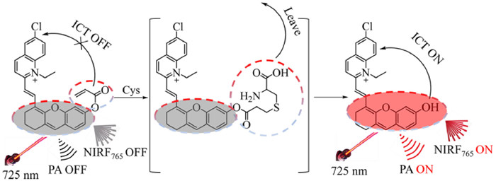 Near-infrared fluorescence (NIR, 650~900 nm) imaging technology has been widely used to detect the level of Cys in vivo due to its advantages of non-invasive and high-sensitivity [17-22]. However, the limited penetration depth of NIR fluorescence probes makes it difficult to image Cys in deep tissues in vivo [23-26]. Photoacoustic imaging (PAI) is an emerging non-intrusive biomedical imaging technology with promising outlook, which integrates the superiorities of conventional optics with acoustics imaging, overcome the limitations of conventional optical imaging and achieve high spatial definition imaging of deep tissues in living animals [27-30]. Therefore, near-infrared fluorescence (NIRF) and photoacoustic (PA) dual-mode imaging are expected to achieve the non-invasive and accurate detection of Cys level in deep liver tissues and facilitate the early diagnosis and treatment of DILI. However, there is still a lack of a PA/NIRF bimodal activated probe with deep-penetrating and rapid-response to reveal the role of Cys in drug-induced liver injury. Therefore, based on the advantages of NIRF and PA dual-modality imaging, it is very important to design a fast and robust probe to detect the change of Cys concentration in deep tissues in vivo. We hope that this strategy would provide a powerful tool for penetrating deep organization, high spatial resolution and high response rate imaging in liver damage.