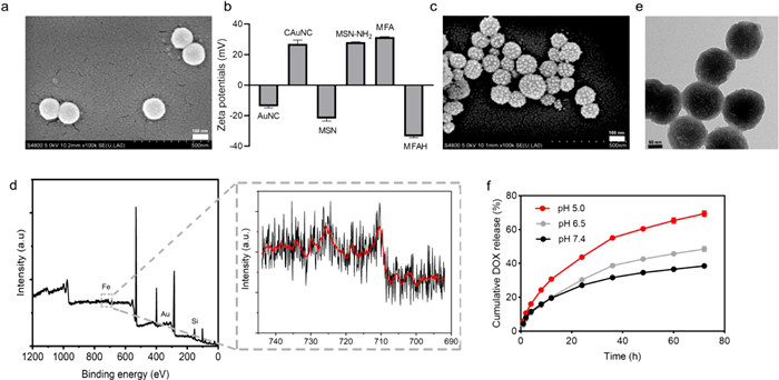 | Fig. 1. The characterization of MFADH. (a) SEM images of MSN-NH2 (Scale bar: 100 nm). (b) Zeta potentials of different nanoparticles. (c) SEM images of MFA (Scale bar: 100 nm). (d) XPS image of MFA and the characteristic peak of Fe. (e) TEM image of MFAH (Scale bar: 50 nm). (f) Cumulative DOX release curve of CAuNC-DOX in pH 5.0, pH 6.5 and pH 7.4 in 72 h. | |