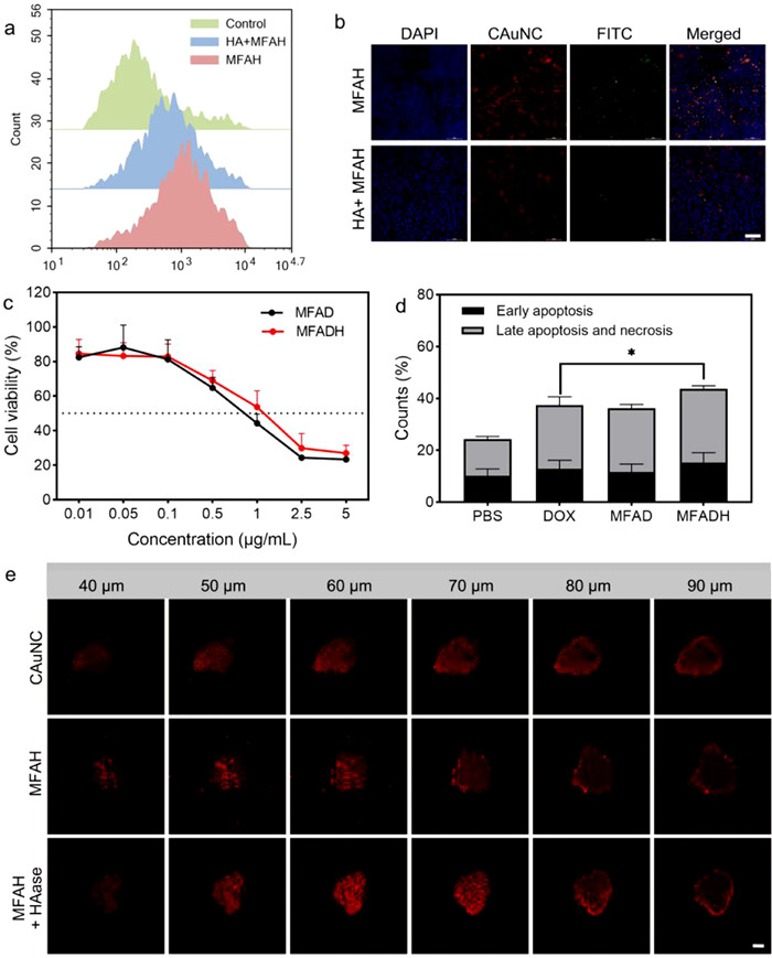 | Fig. 2. (a) Cellular uptake of 4T1 after preincubated with or without HA followed by incubated with FITC-labeled MFAH, detected by flow cytometry. (b) CLSM images of cellular uptake of 4T1 after preincubated with or without HA followed by incubated with FITC-labeled MFAH (Scale bar: 100 nm). (c) Cytotoxicity of MFAD and MFADH on 4T1 cells, the concentration represents the loaded DOX in the preparations. (d) Flow cytometric analysis of apoptotic cells after different treatments: PBS (blank), DOX, MFAD, MFADH. (e) Penetration of different nanoparticles into tumor spheroids (Scale bar: 100 nm). | |