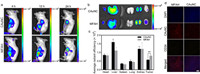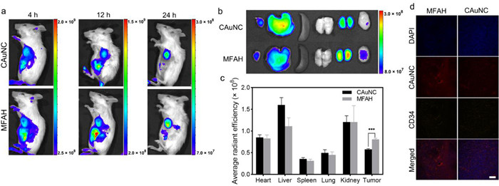 | Fig. 3. In vivo distribution of CAuNC and MFAH. (a) In vivo fluorescent imaging of ICG signal at different time points, the unit of radiant efficiency is [(p/sec/cm2/sr)/(µW/cm2)]. (b) Ex vivo imaging of CAuNC signal of organs and tumors (left to right are respectively heart, liver, spleen, lung, kidneys and tumor). (c) Semi-quantification of average radiant efficiency of ex vivo organs and tumors. (d) The slices of ex vivo tumors imaged by CLSM, blue represents nucleus stained by DAPI, red represents the signal of CAuNC, and orange represents blood vessels marked by Cy3-conjugated anti-CD34 antibody. The scale bar represents 100 µm. | |