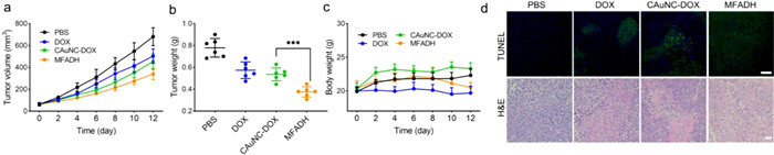 Finally, the antitumor effects of MFADH were evaluated in 4T1-tumor bearing BALB/c mice in vivo. As shown in Fig. 4a, the average tumor volume of mice in PBS group increased to 700 mm3 at the end of the treatment. Without big size nanocarriers to delivery antitumor drugs, the groups of DOX and CAuNC-DOX showed certain therapeutic efficiency but not as well as the groups of MFADH group, which was consistent with the tumor weight showed in Fig. 4b. Changes in body weight of the mice could reflect the systemic toxicity of drugs. As shown in Fig. 4c, the mice of MFADH group got slightly body weight reduction during the treatment, however, the body weight of the mice in DOX group decreased faster than that of MFADH group, which corroborated that MFADH could reduce the toxicity of DOX. The TUNEL and H & E of tumor slices also confirmed that MFADH group had the highest tumor cell apoptosis and had the most prominent damage in the tumor tissue (Fig. 4d). The H & E of major organs indicated that BALB/c mice treated with MFADH showed no obvious histopathological damage in the major organs compared to the PBS treated mice (Fig. S5 in Supporting information), which proved that MFADH possessed ideal biological safety. All the result above indicated that MFADH had the possibility to inhibit tumor growth and the size reduction strategy could enhance the efficiency of drug delivery and improve antitumor effect.