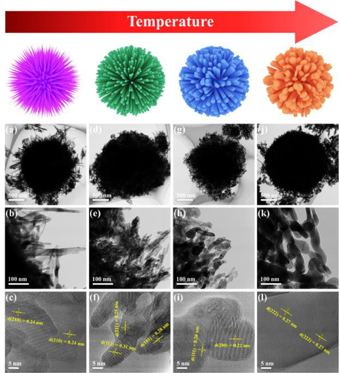 Transmission electron microscopy (TEM) was used to study morphologies and microstructure of MnOx materials. All MnOx materials showed spherical morphologies with an average diameter of approximately 2 µm (Figs. 2a, d, g and j), indicating that the calcination temperature has negligible effects on the size of porous MnOx microspheres. The magnified TEM image in Figs. 2b illustrated that MnO2 microspheres were assembled by slender nanoneedles. The high-resolution transmission electron microscopy (HR-TEM) image (Fig. 2c) on these nanoneedles clearly displayed well-defined lattice fringes with d-spacing of 0.24 nm, which is attributed to the crystal plane of (210) from MnO2. By increasing calcination temperature, orthorhombic MnO2 were phase-transformed to tetragonal Mn3O4, cubic MnO and cubic Mn2O3. Accordingly, the assembly unit of MnOx microspheres was changed from nanoneedles to nanowires (Fig. 2e), nanorods (Fig. 2h) and large-size irregular nanorods (Fig. 2k). Furthermore, distinct lattice fringes on these assembly units were observed from HR-TEM images (Figs. 2f, i and l) to further confirm the formation of Mn3O4, MnO and Mn2O3, respectively.