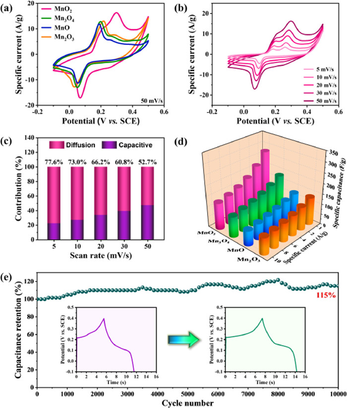 | Fig. 3. (a) CV curves of MnOx electrodes at 50 mV/s. (b) CV curves of MnO2 electrode at scan rates of 5, 10, 20, 30 and 50 mV/s. (c) Contribution ratio of capacitive and diffusion-controlled mechanism at different scan rates for the MnO2 electrode. (d) Specific capacitance values of MnOx electrodes at different specific currents. (e) Cycle stability of MnO2 electrode at 10 A/g (inset: GCD curves before and after cycling test). | |