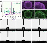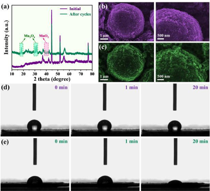 | Fig. 4. (a) XRD patterns of MnO2 electrode before and after cycling test. SEM images of MnO2 electrode (b) before and (c) after cycling test. Contact angle measurements with 6 mol/L KOH electrolyte of MnO2 electrode (d) before and (e) after cycling test at 0, 1 and 20 min. | |