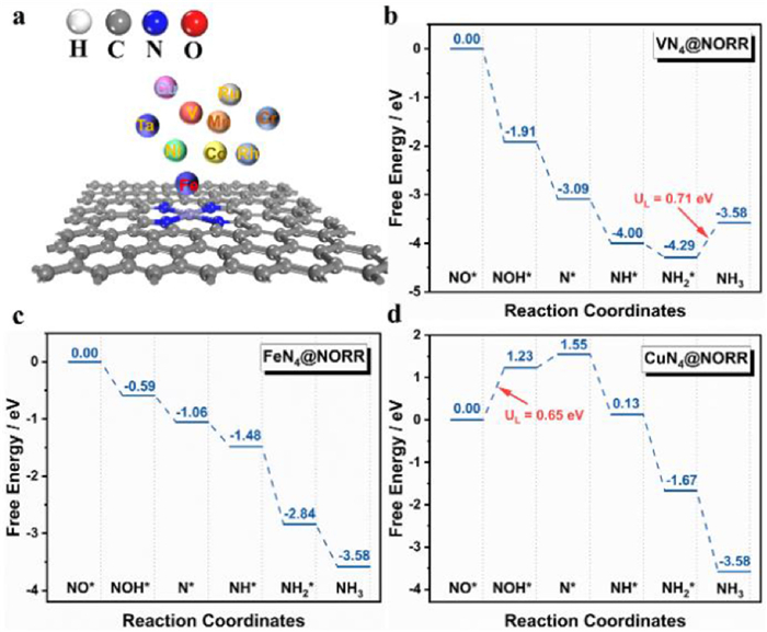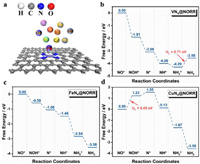 | Fig. 1. (a) Structure of TM-N4 and the considered TM atoms. (b-d) Free energy diagrams of NO reduction to NH3 on V-N4, Fe-N4 and Cu-N4 under 0 V vs. RHE. | |