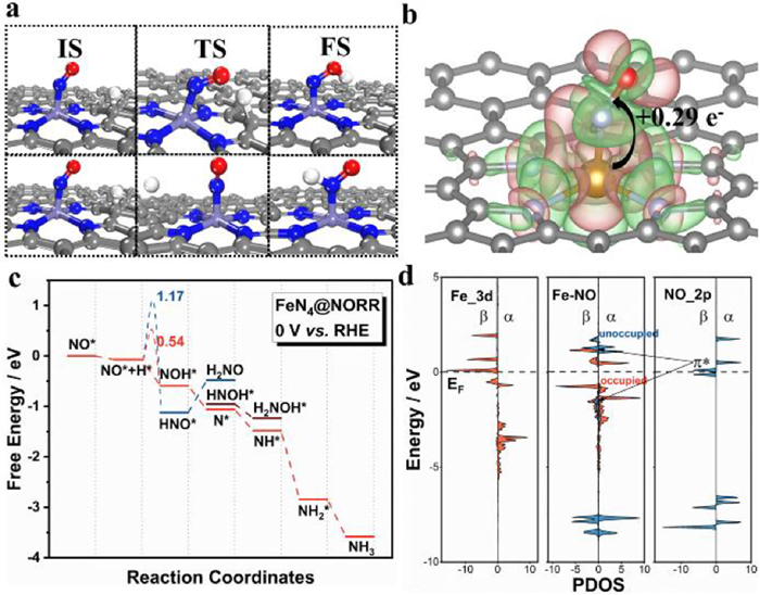 | Fig. 2. NORR over Fe-N4. (a) Geometries of the IS, TS and FS for NO* with H* to NOH* or HNO*. (b) Differential charge density plot and Bader charge analysis of NO adsorbed. (c) Free energy diagrams of NORR via HNO* or NHO*. (d) Projected density of states (PDOS) of Fe-3d orbitals for Fe-N4, Fe-3d and NO-2p orbitals for NO adsorbed on Fe-N4 and NO-2p orbitals for free NO molecule, respectively. | |