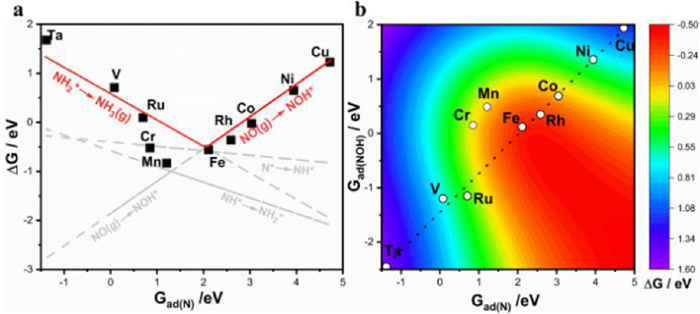 | Fig. 4. (a) Thermodynamic estimation and screening catalysts of NO to NH3 via ∆G plotted versus Gads(N*). (b) A two-dimensional activity map for ammonia production. | |