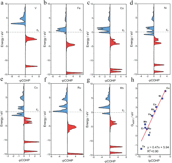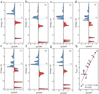 | Fig. 5. (a-g) Projected crystal orbital Hamilton population (pCOHP) between the metal center and the adsorbed nitrogen atom. (h) The correlation be-tween integrated COHP (ICOHP) and the adsorption free energy of nitrogen adatom (Gads(N*)). | |