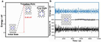| Fig. 3. (a) Formation energy barrier of the decoration of Fe atom on different sites of N-doped graphene. (b) Variation of temperature and total energy of single Fe-N4 during AIMD simulation. The simulation was running under 300 K for 10 ps with a time step of 2 fs. | |